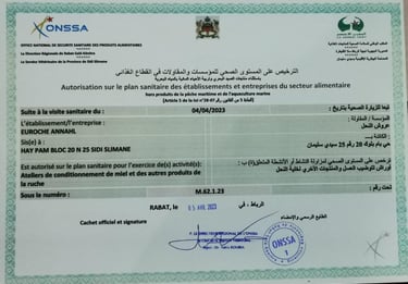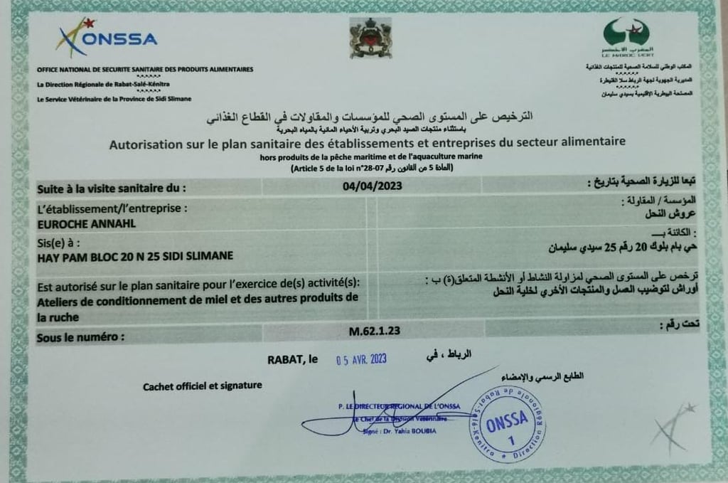 Euroch Annahl est une coopérative marocaine spécialisée dans la production et la commercialisation de miel 100 % naturel. Nous produisons notre propre miel, sans intermédiaire, et le proposons directement dans nos trois points de vente au Maroc : Meknès, Benguerir et Tanger. Tous nos produits sont certifiés et autorisés par l’ONSSA, garantissant qualité et sécurité alimentaire.